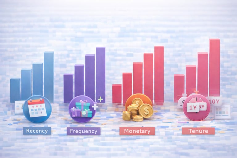RFMT brings Recency, Frequency, Monetary value, and Tenure together to describe how donors give and how relationships mature.