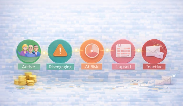 By grouping donors based on recent activity, this perspective treats donor status as a management signal. It helps organizations see where engagement is holding, where it is weakening, and where attention is most urgently needed to prevent loss or support momentum.