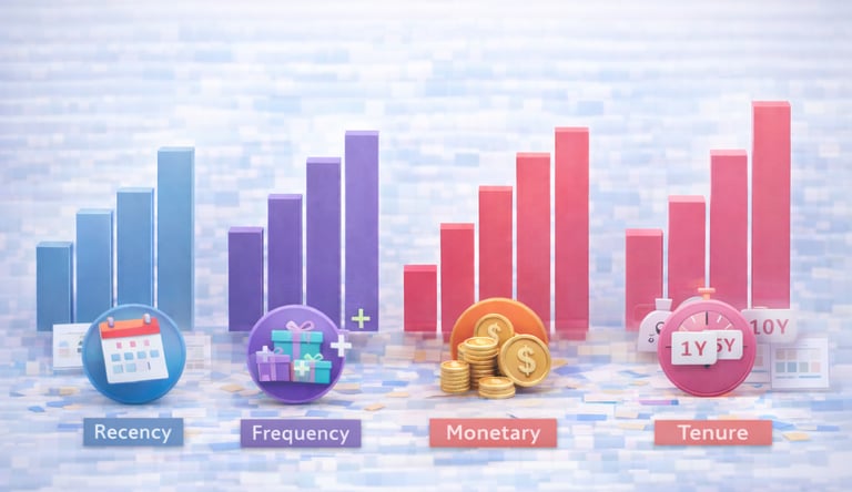 By incorporating tenure, RFMT distinguishes between donors whose activity is intense but recent and those whose behavior has matured over time. This separation prevents short-term activity spikes from being mistaken for long-term stability.